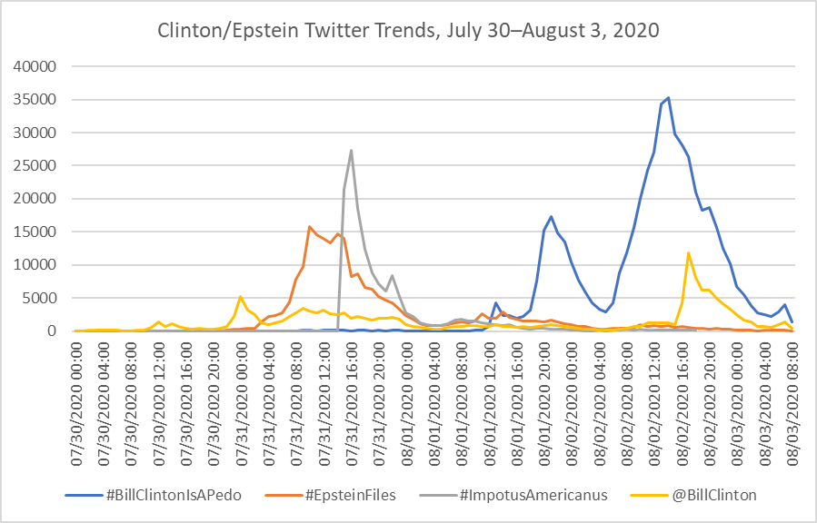 As if this apparent media bias was not enough, it seems that Twitter suppressed the news about Clinton on July 31. Indeed, when Clinton was trending that day, Twitter apparently spun it to be related to the former president’s eulogy for John Lewis, rather than for the new details tying him to Epstein’s island. At about 7 pm EST, Epstein, mentioned in 958,000 tweets, somehow only merited a #25 trend ranking; even then, the news story Twitter associated with his name was only about Dershowitz’s reaction to an episode of The Good Fight that mentioned his—not Clinton’s!—connection with Epstein. Meanwhile, the Lincoln Project’s latest anti-Trump video “Impotus Americanus” was ranked #1, with less than 78,000 tweets at the time. Although data from TalkWalker demonstrates that “Impotus Americanus” clearly dominated Twitter for a few hours, it was a flash in the proverbial pan.